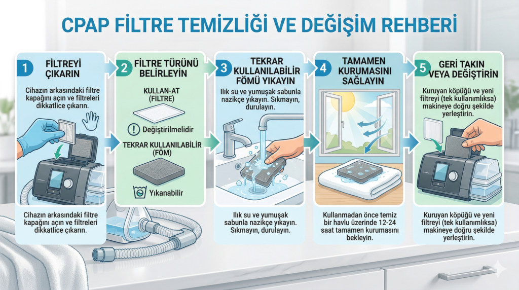 Özellikle düzenli CPAP kullanan kişiler için küçük görünen filtre bakımı, aslında günlük tedavi kalitesini doğrudan etkileyen önemli bir detaydır.
